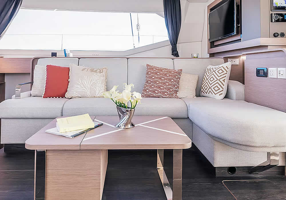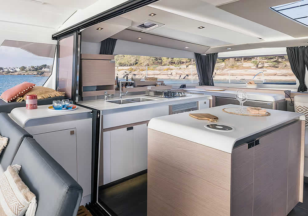 Fly-bridge & fore-deck sun lounger, Hydraulic tender platform, Large cockpit table, BBQ Gas Plancha, Underwater lighting, Solar panel 2000W, Hot deck shower.